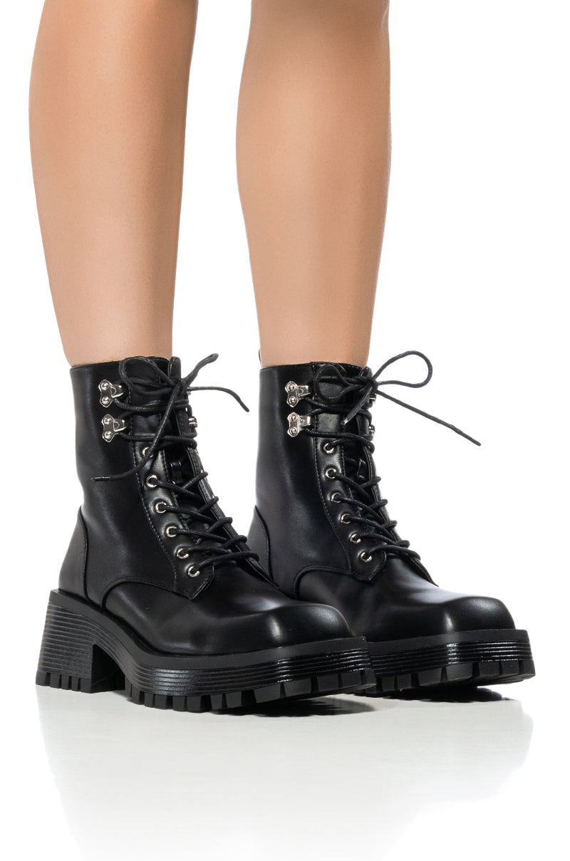 Stomp through your city in The AZALEA WANG Exton Black Combat Black. This square toe style features a faux leather upper. a lace up shaft. tonal stitching. silver metallic hardware. and a durable stacked rubber outsole. Complete with a mid-calf height shaft. a platform lug sole. a coordinating chunky heel. and a back ankle pull tab. Wear with a denim midi skirt and a graphic tee for an updated take on a punk look.