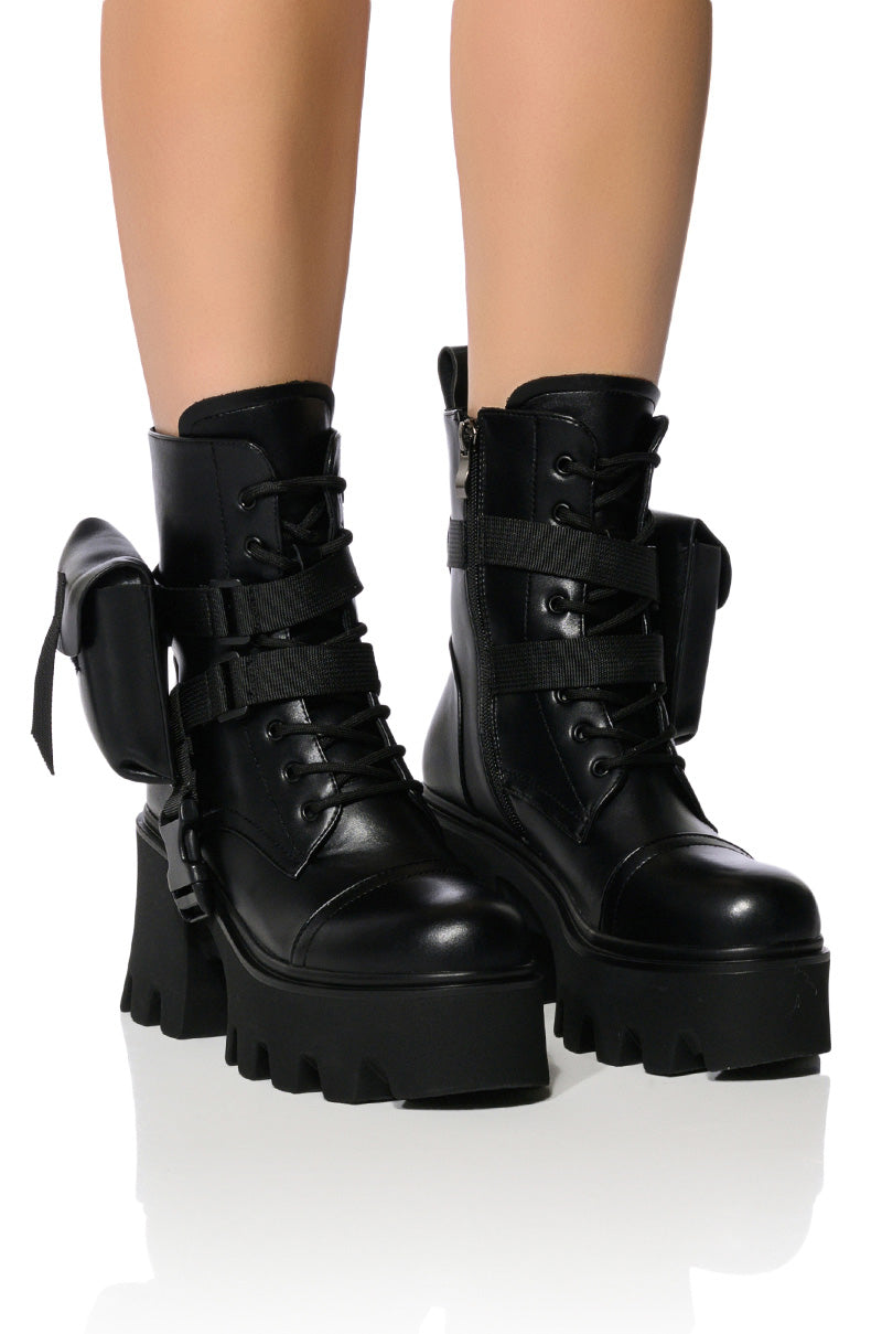 The AZALEA WANG Follow Chunky Combat Bootie In Black is made from a vegan leather upper and features a mid-calf height shaft. a lace-up vamp. and strappy detailing with a mini velcro pouch on the side. Complete with a chunky heel. ridged sole. and an inner ankle zipper closure.