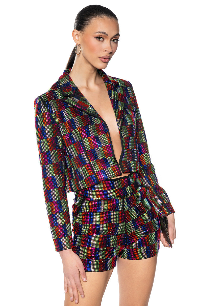 POP STAR RECTANGLE PRINT RHINESTONE CROP BLAZER